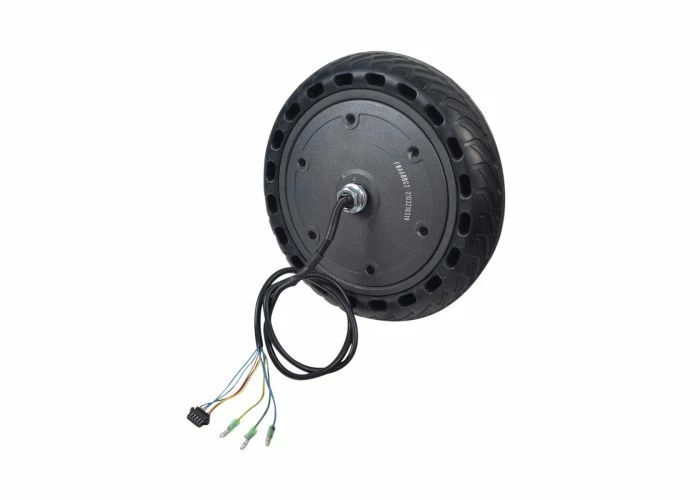This front wheel and hub motor combination comes with the axle, nuts, washers, and an 8-wire harness.