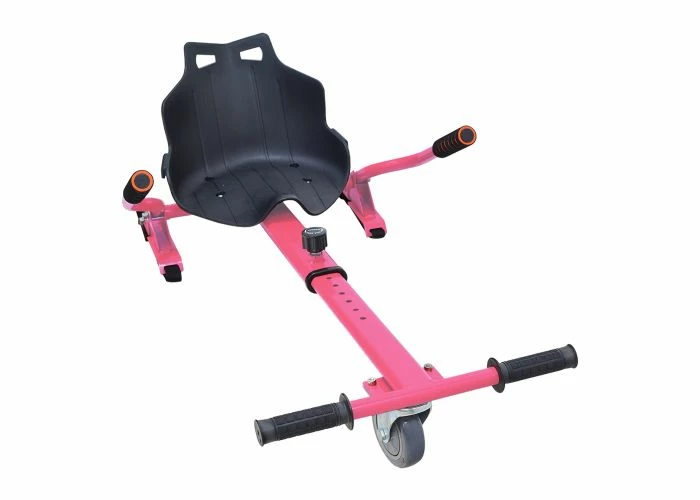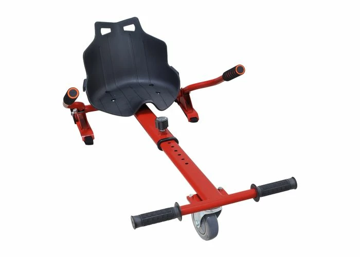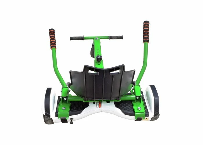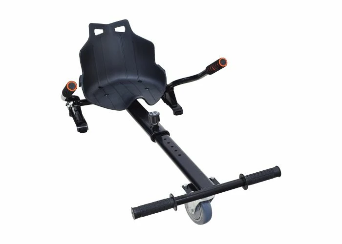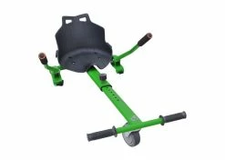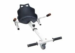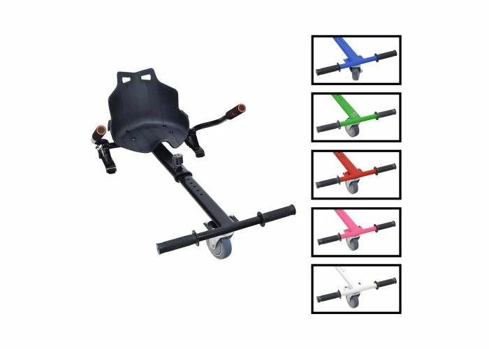 The assembly includes a copious ‘kart-style seat, the front caster wheel & fork, the length-adjustable go-kart frame, and a pair of handlebar levers that you use to control forward motion and direction. In addition, we offer these kits in several color options. This kit does not include a hoverboard.